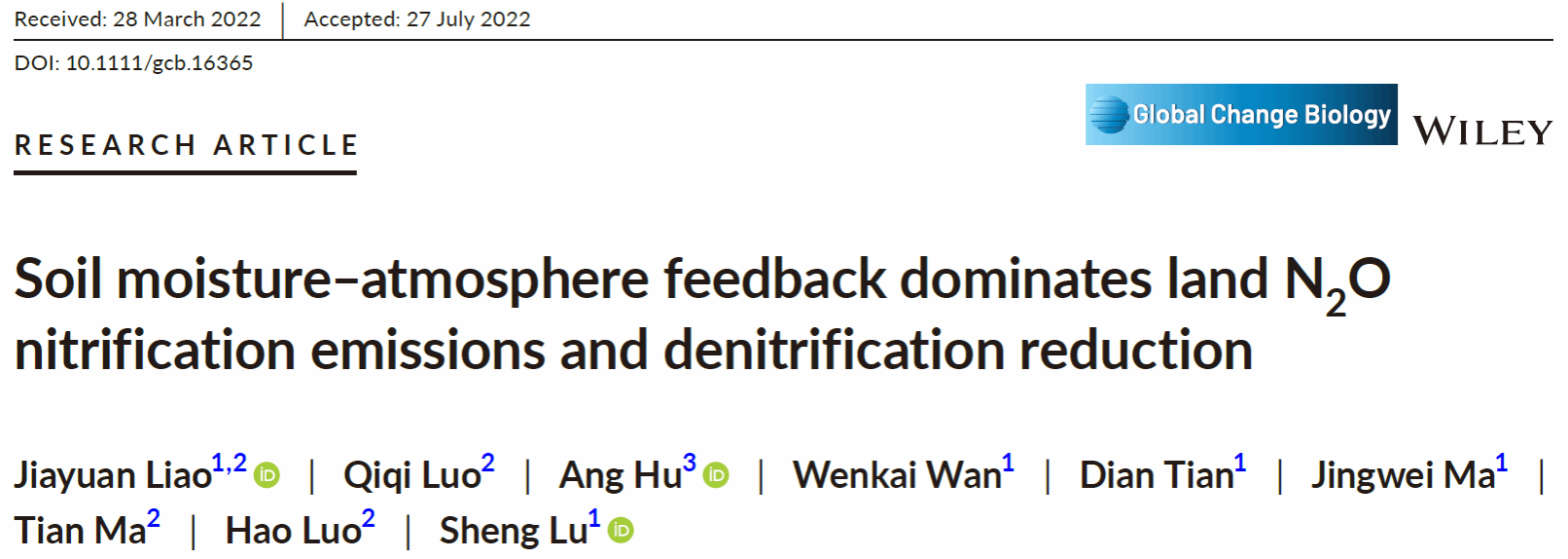 2022727,生态学领域TOP期刊《Global Change Biology(中科院一区IF: 13.211)在线发表了水土保持系题为“Soil moisture–atmosphere feedback dominates land N2O nitrification emissions and denitrification reduction”的研究论文。文章探究了全球陆地-大气相互作用对N2O通量的影响,证明了土壤含水量-大气之间反馈调节对土壤反硝化速率及N2O排放的作用机制。